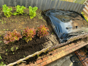看板の前には小さな箱庭に、終盤のブロッコリーやレタス・チシャなどが